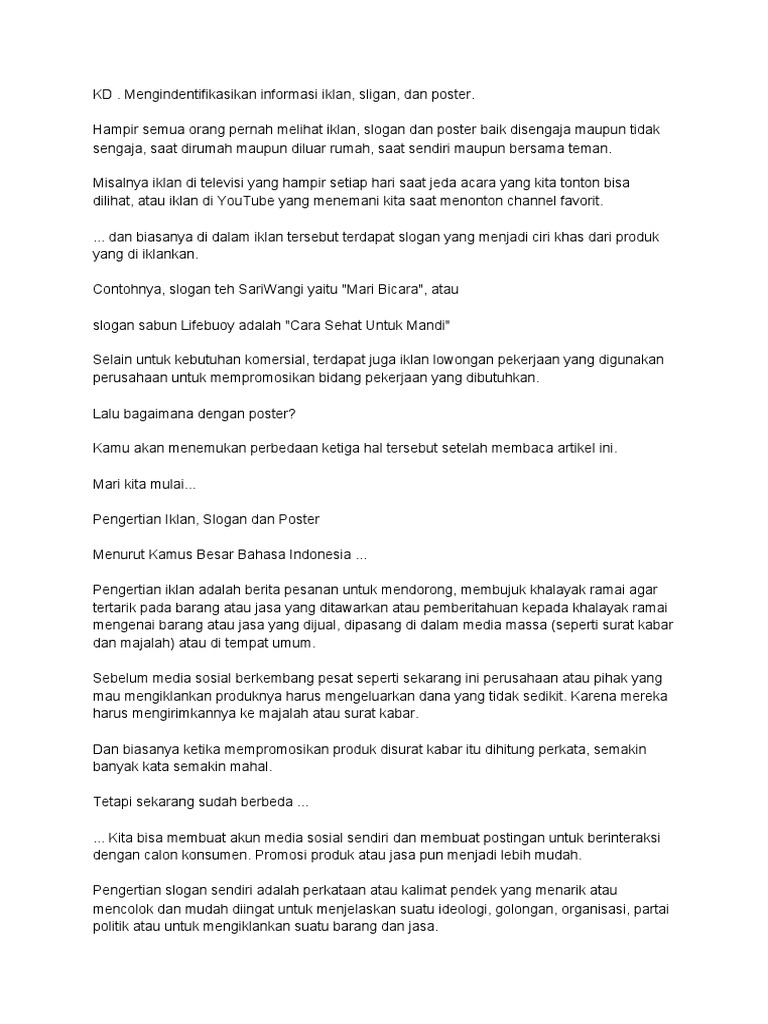 Iklan selalu ada pada tempat yang ramai dan tertarget. Hemat energi akan menyelamatkan lingkungan b. Materi bahasa indonesia kelas viii semester 1 pada bab 2 yaitu mengenal teks iklan, slogan, dan poster. E.perbedaan iklan, slogan dan poster bentuk teks. Kalimat yang singkat memang menjadi ciri khas dari poster. Tetapi spesies angsa jantan mirip dengan spesies angsa betina untuk menunjukkan sifat dimorfisme seksual. Memiliki beragam warna yang mencolok. Poster propaganda yaitu poster yang berisi tentang pengaruh yang diberikan kepada masyarakat a. Apakah kedua contoh teks laporan percobaan di atas sudah memenuhi syarat sebagai teks laporan jika dilihat dari ciri ciri teks laporan percobaan. Gagasan pendukung paragraf kedua yaitu. Poster dapat juga didefinisikan sebagai kombinasi visual dan rancangan yang kuat, dengan warna, dan pesan dengan maksud adapun fungsi dari poster yaitu, sebagai media promosi dan informasi untuk memberikan informasi berupa ajakan sebagai media untuk berkampanye. Poster bisa dijadikan sebagai sarana iklan, pendidikan, sosialisasi, propaganda dan dekorasi. Yaitu iklan harus bisa menggunakan medium bahasa yang tepat.